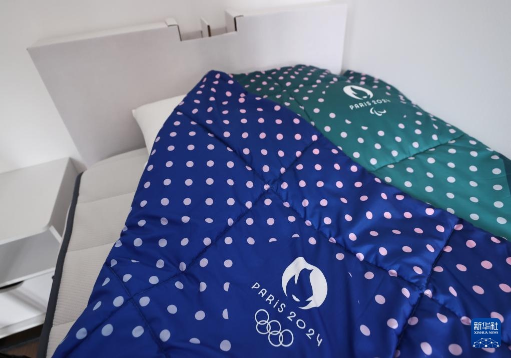 這是6月4日在巴黎奧運村和殘奧村內拍攝的帶有巴黎奧運會標識的床上用品。新華社記者 高靜 攝