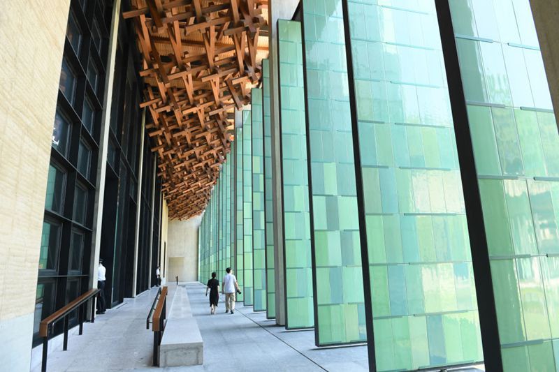 2022年7月23日,杭州國家版本館屋頂的木構和青瓷門扇相映成趣。