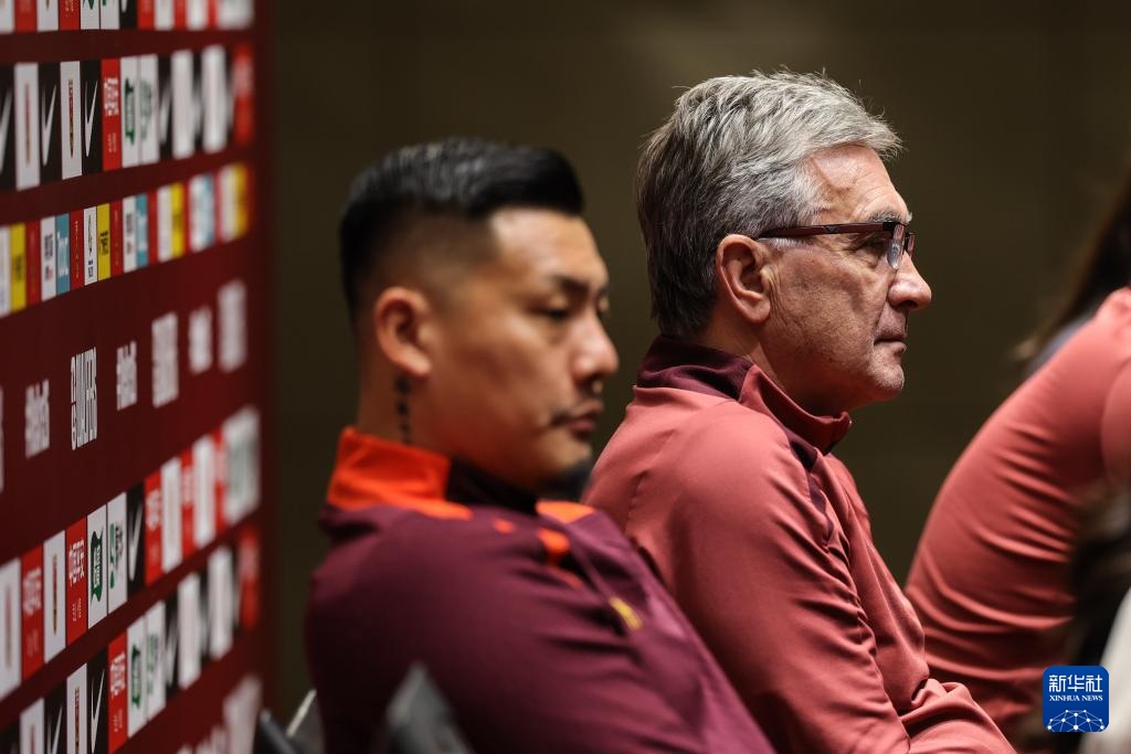 6月5日,中國隊(duì)主教練伊萬科維奇(右)和門將王大雷在新聞發(fā)布會現(xiàn)場。新華社記者 潘昱龍 攝