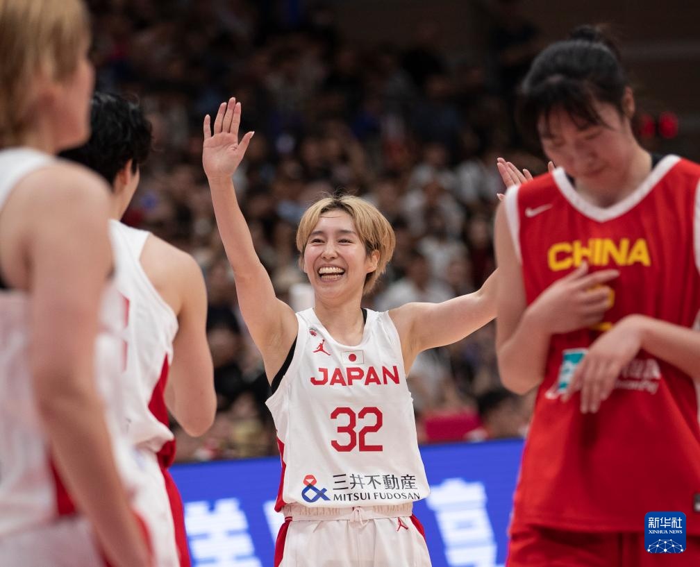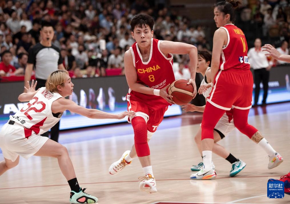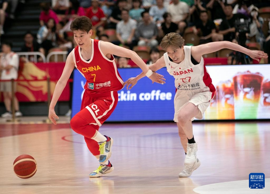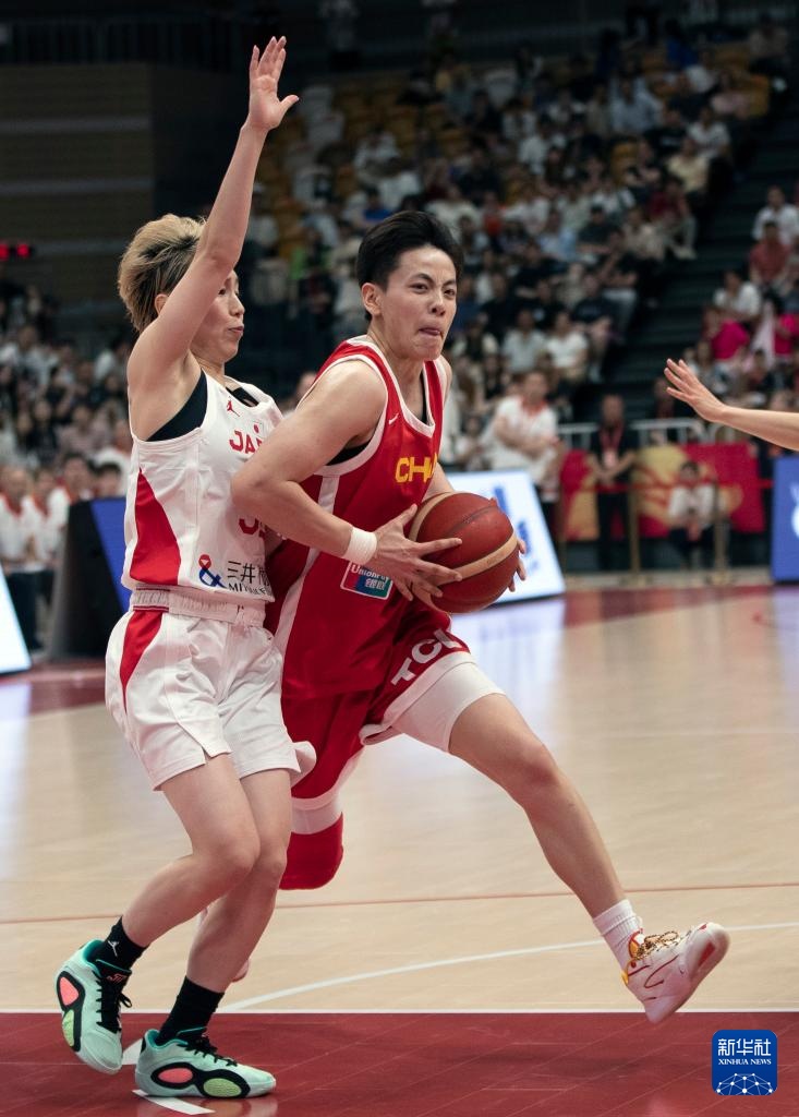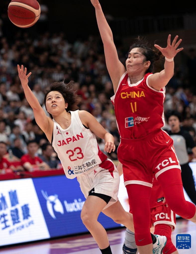 6月5日,中國隊球員潘臻琦(右)在比賽中封蓋日本隊球員山本麻衣的上籃。新華社記者 雒圓 攝