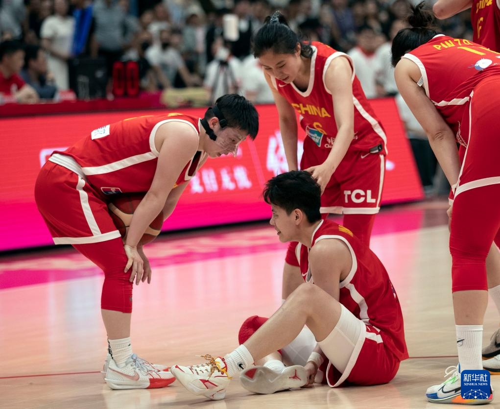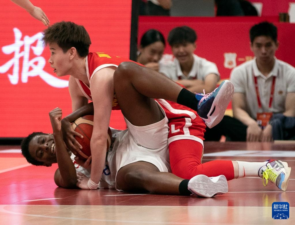 6月5日,中國隊球員安慰因拼搶倒地的隊友楊舒予(下)。新華社記者 雒圓 攝