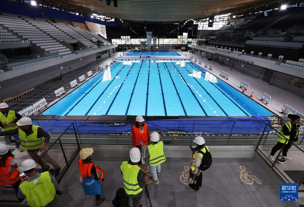 6月5日,媒體記者在巴黎奧林匹克水上運動中心采訪。新華社記者 高靜 攝