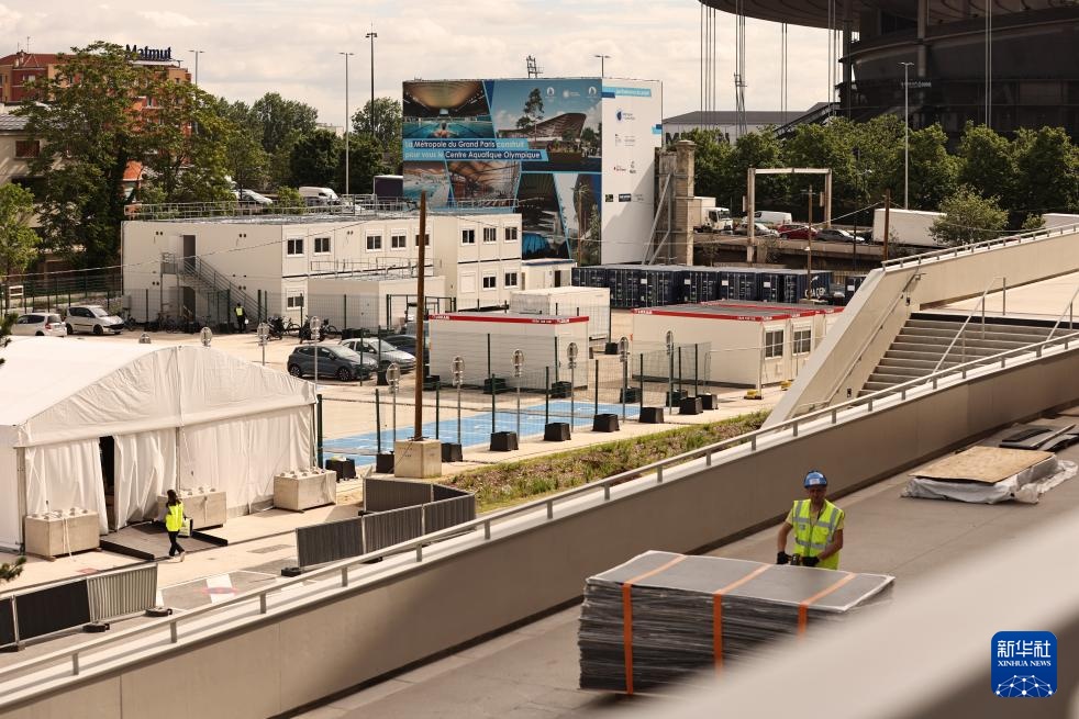 這是6月5日拍攝的巴黎奧林匹克水上運動中心尚未完工的施工現場和對面的法蘭西體育場,牌子上寫著“巴黎大區為您建造奧林匹克水上運動中心”。新華社記者 高靜 攝