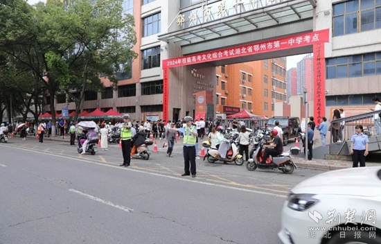 設置禁鳴標志、引導車輛有序通行、在考場周圍開展交通安全整治……6月7日7時30分,在鄂州高中考點附近,交警正緊張有序地維護交通秩序。