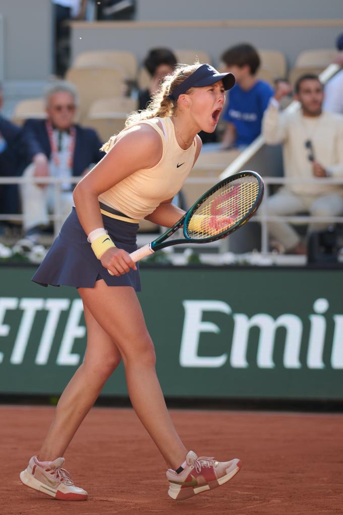 6月5日,米拉·安德烈耶娃在法網(wǎng)女單四分之一決賽中慶祝得分。新華社記者 孟鼎博 攝
