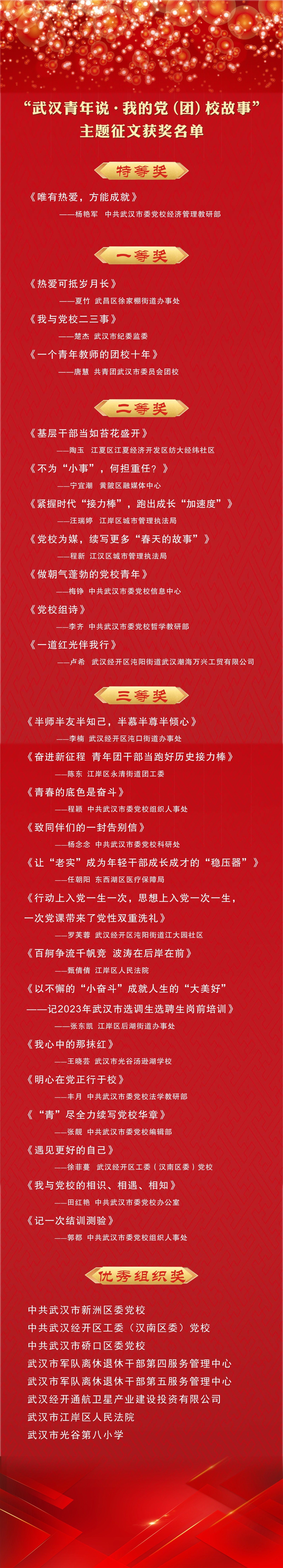 荊楚網(湖北日報網)訊(通訊員 張麗 熊瑞 張靚)6月7日下午,“武漢青年說·我的黨(團)校故事”主題征文分享活動在武漢市委黨校7號樓學術會議廳舉行。本次活動由中共武漢市委黨校、共青團武漢市委員會主辦,荊楚網(湖北日報網)和楚天網絡評論研究院協辦,市紀委監(jiān)委派駐市委組織部紀檢組組長宋丹、團市委副書記郎坤、武漢市委黨校全體校委等領導出席,正在孝昌支教的武漢市委黨校退休教師張葆珺也帶著澴西學校的孩子們參加了活動?!拔錆h青年說·我的黨(團)校故事”主題征文活動自4月7日啟動,截止4月21日共收到作品152篇,經專家評審,產生獲獎作品25篇。