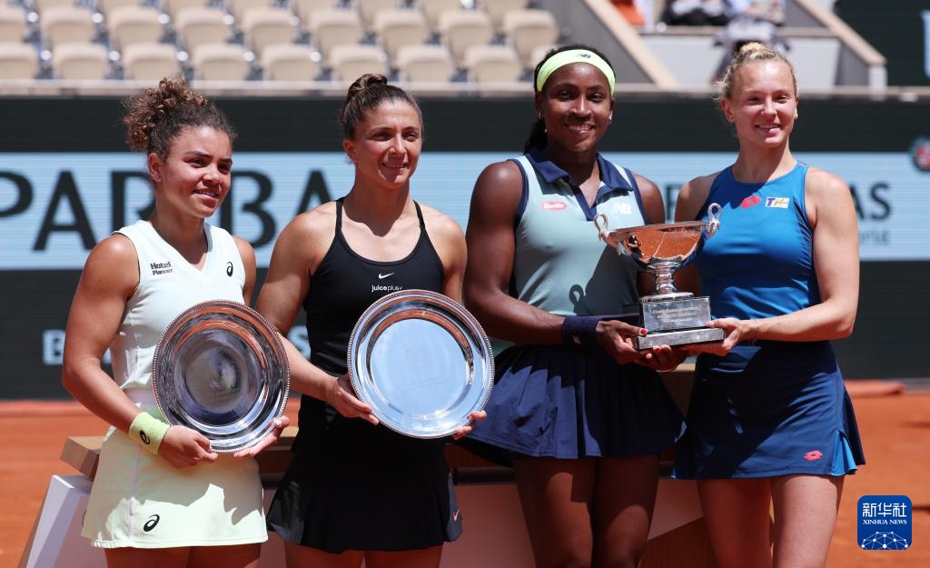 6月9日,高芙(右二)/西尼亞科娃(右一),保利尼(左一)/埃拉尼在頒獎(jiǎng)儀式上。