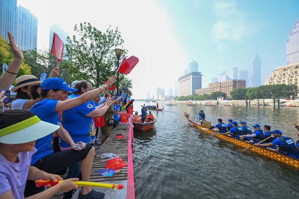 本次比賽為200米直道競速,設外企組、大學組和社會組。比賽中,不同國籍、不同膚色、不同語言的龍舟選手振臂劃槳,奮勇向前。鑼鼓聲、劃槳聲、吶喊聲,與岸邊、橋上觀眾的助威聲、歡呼聲交織在一起,響徹海河兩岸。