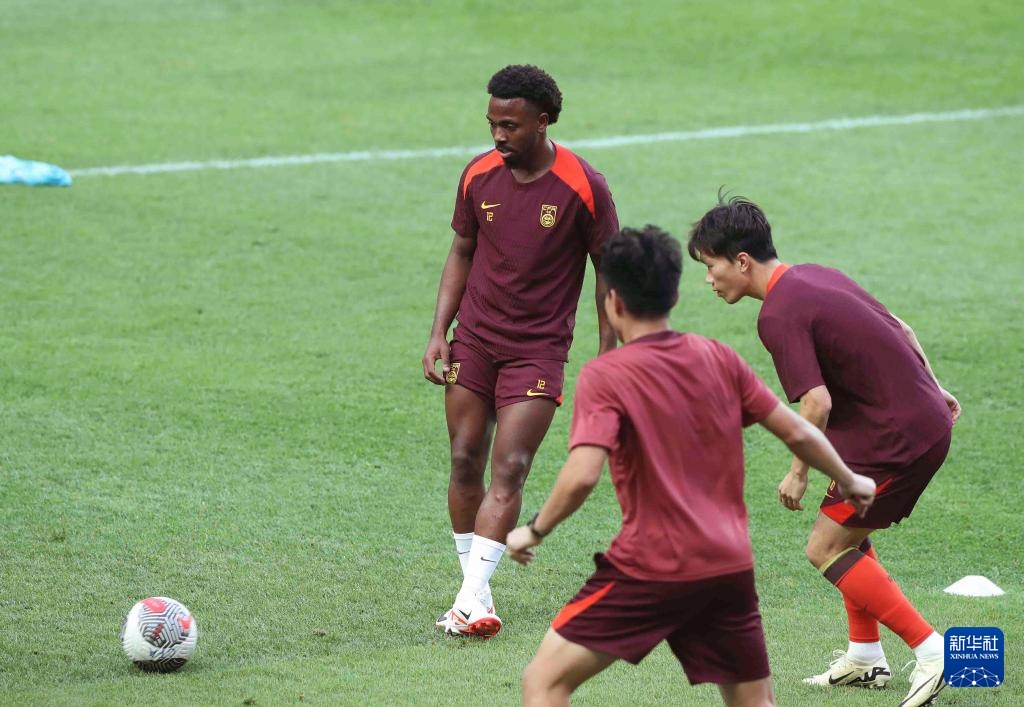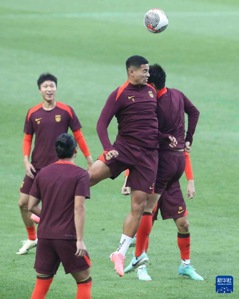 6月10日,中國隊(duì)球員費(fèi)南多(左)在訓(xùn)練中。新華社記者 姚琪琳 攝