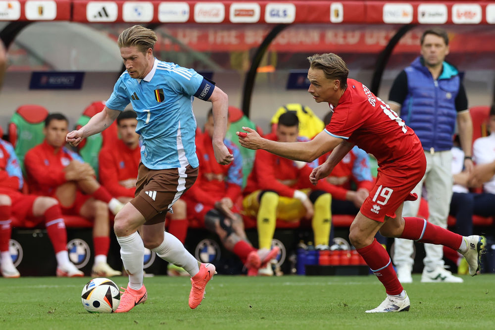 6月8日,比利時隊球員德布勞內(左)在一場友誼賽中帶球。新華社記者 趙丁喆 攝