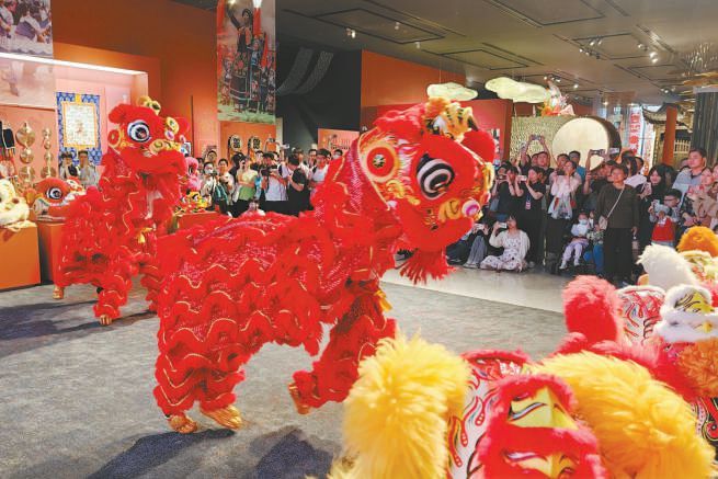 “快來,舞獅表演開始了!”隨著鑼鼓擂響,“氣象萬千——中國非遺保護實踐主題展”的民俗展演區域聚滿了觀眾,兩頭精氣神十足的廣東醒獅登場。廣東醒獅的基本動作包括睜眼、洗須、舔身、抖毛等,主要套路有采青、高臺飲水、獅子吐球、踩梅花樁等。演出的尾聲,兩頭醒獅吐出一副對聯——“賡續歷史文脈”“保護傳承非遺”,引得觀眾連連叫好。