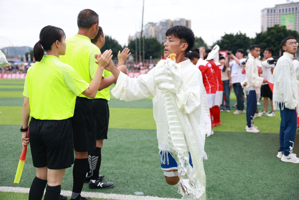 此間戰(zhàn)罷,另一場“青春”對決又拉開帷幕,對陣雙方是日喀則市珠峰雪鷹隊和榕江縣青少年“班超”聯(lián)隊。賽前握手環(huán)節(jié),珠峰雪鷹隊隊員給對手獻上哈達表示敬意和祝福,榕江縣青少年“班超”聯(lián)隊則給對方戴上了印有“人生就應該有追球”字樣的“村超”主題圍巾。