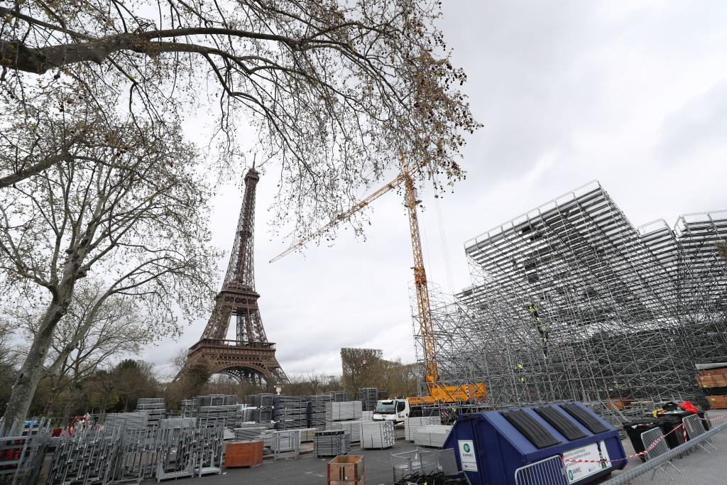↑4月2日在埃菲爾鐵塔附近戰神廣場拍攝的奧運比賽場地和看臺建設現場。