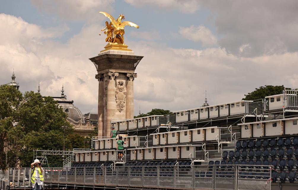 ↑6月4日在位于巴黎市中心的亞歷山大三世橋拍攝的臨時比賽場地搭建現場。