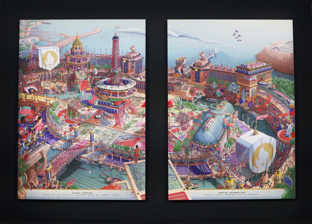 ↑3月4日在巴黎奧賽博物館拍攝的巴黎奧運會官方海報(左)和殘奧會官方海報。
