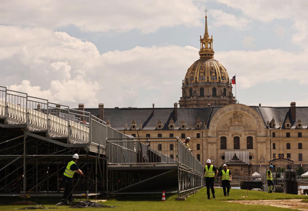 ↑6月4日在位于巴黎市中心的榮軍院廣場拍攝的臨時比賽場地搭建現場。