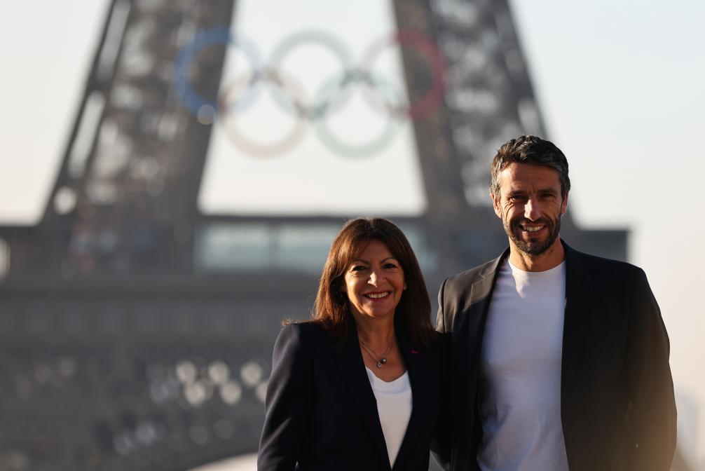 ↑6月7日,巴黎奧組委主席托尼·埃斯坦蓋(右)和巴黎市長伊達爾戈與懸掛奧運五環標志的埃菲爾鐵塔合影留念。