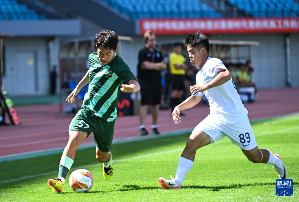 6月13日,浙江俱樂部U21隊球員張嘉偉(左)和南通支云U21隊球員張宇燁在比賽中拼搶。新華社記者 貝赫 攝