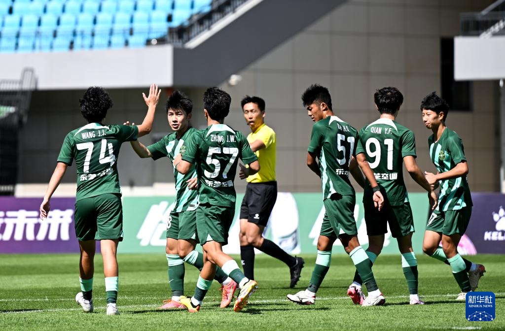 6月13日,浙江俱樂部U21隊球員王林杰(左二)在比賽中與隊友慶祝進球。新華社記者 貝赫 攝