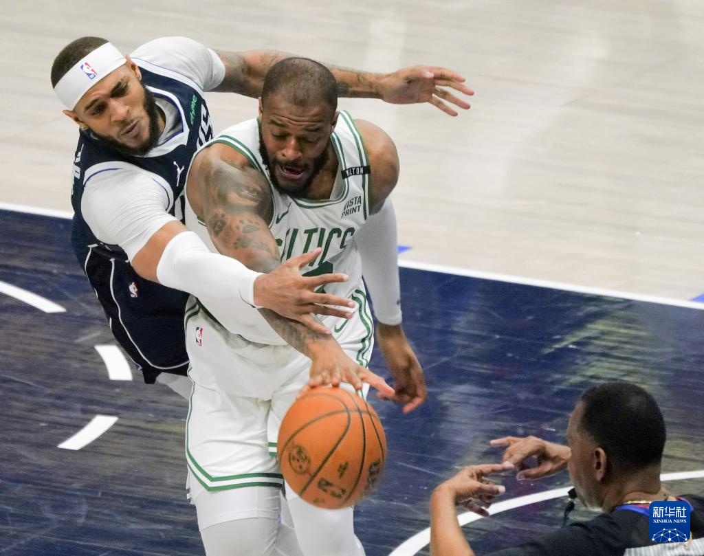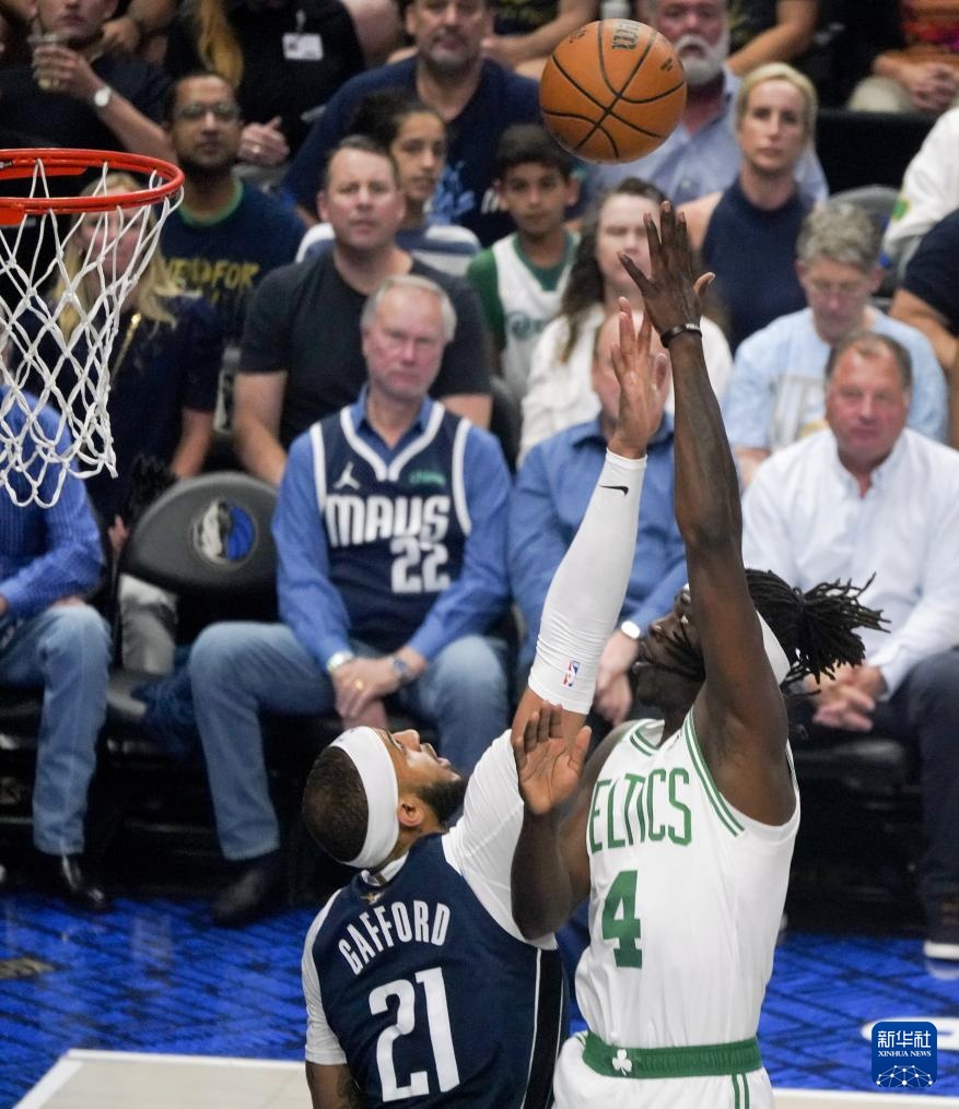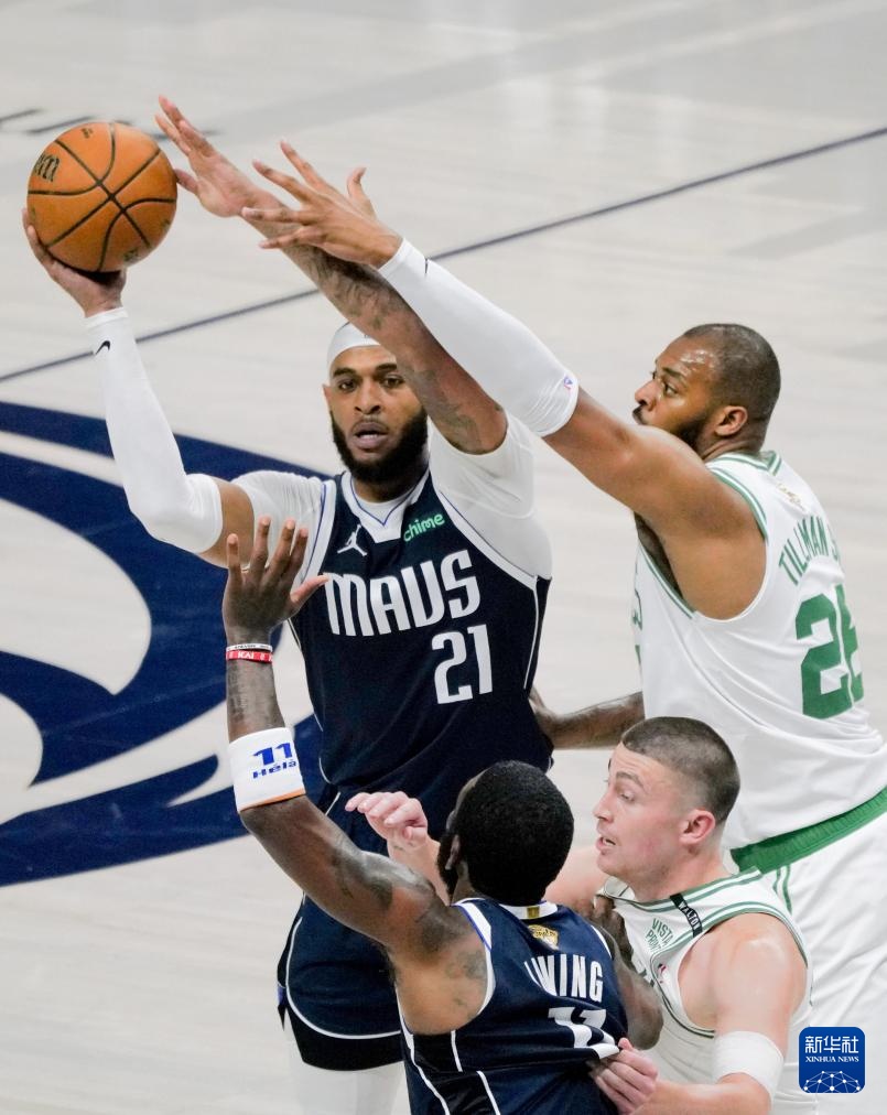 6月12日,獨行俠隊球員丹尼爾·加福德(左)與凱爾特人隊球員澤維爾·蒂爾曼拼搶。新華社記者 吳曉凌 攝