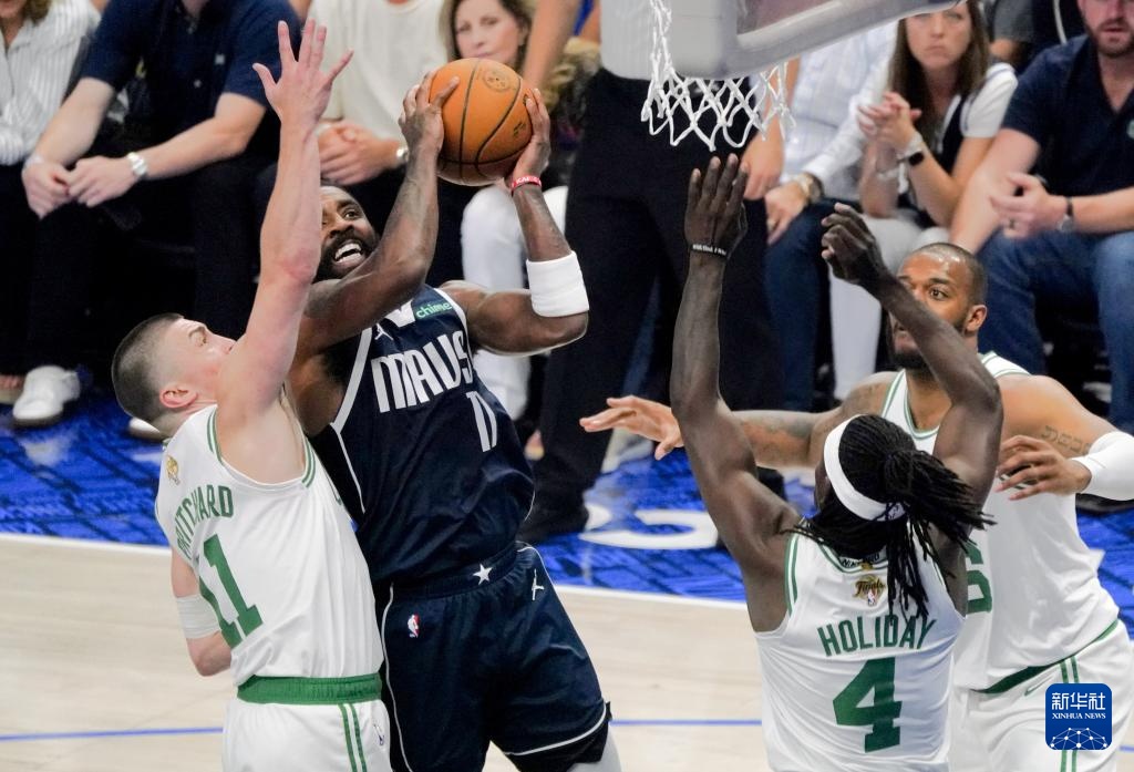 6月12日,獨行俠隊球員凱里·歐文(左二)在比賽中上籃。新華社記者 吳曉凌 攝