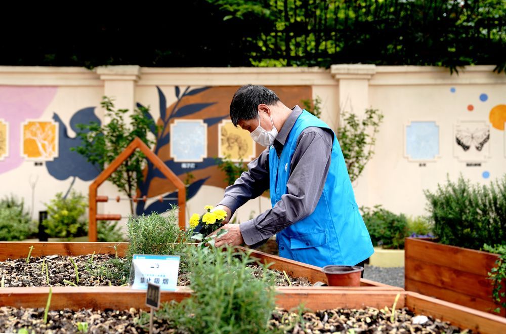上海市長寧區虹旭小區居民在整理改造社區花園。居民們把堆肥箱里發酵出來的“綠色材料”和土壤拌在一起鋪在種植箱中