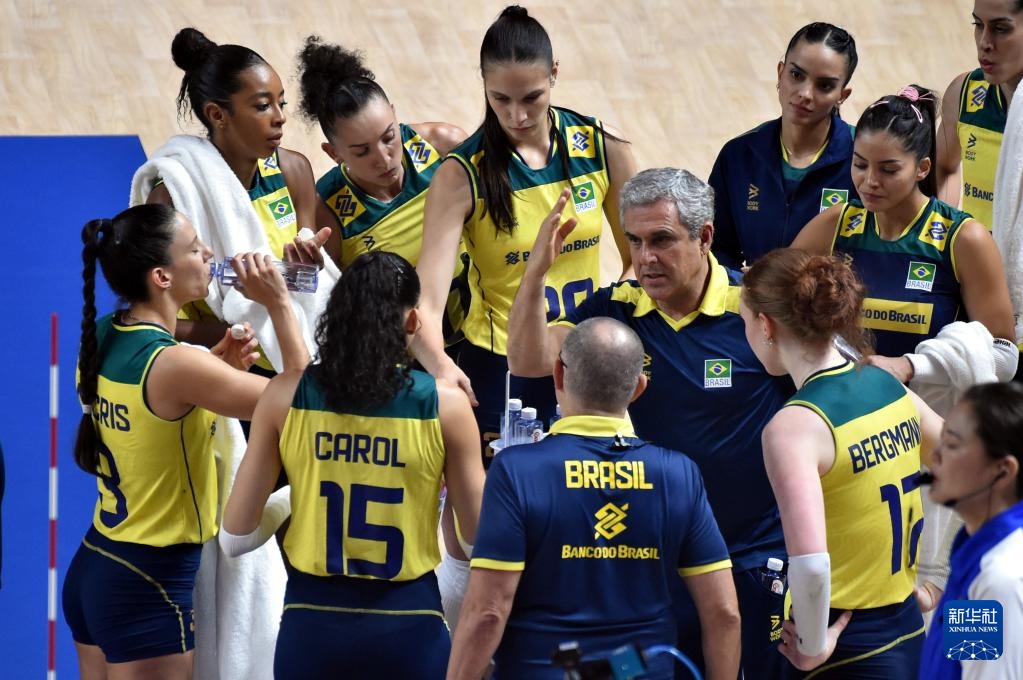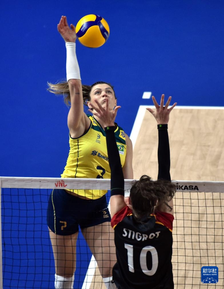 6月13日,巴西隊球員羅薩瑪利亞·蒙蒂貝勒(上)在比賽中扣球。新華社記者 盧炳輝 攝