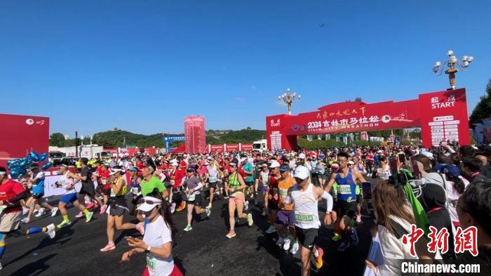 6月16日,2024吉林市馬拉松鳴槍開跑,來自18個國家和地區的30000名選手沿松花江岸展開激烈角逐,圖為選手們出發。 石洪宇 攝