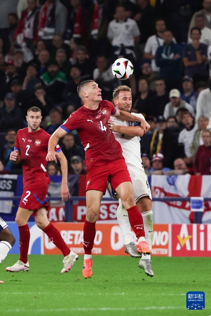 6月16日,塞爾維亞隊球員尼古拉·米倫科維奇(前左)和英格蘭隊球員哈里·凱恩在比賽中爭搶頭球。新華社記者 張帆 攝