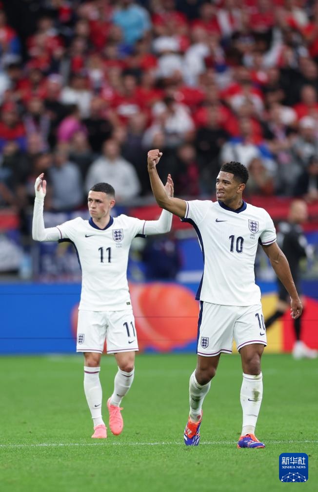 6月16日,英格蘭隊球員貝林厄姆(右)和隊友福登在比賽中慶祝進球。新華社記者 白雪飛 攝