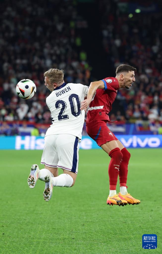 6月16日,英格蘭隊球員賈羅德·鮑溫(左)和塞爾維亞隊球員菲利普·姆拉德諾維奇在比賽中拼搶。新華社記者 白雪飛 攝