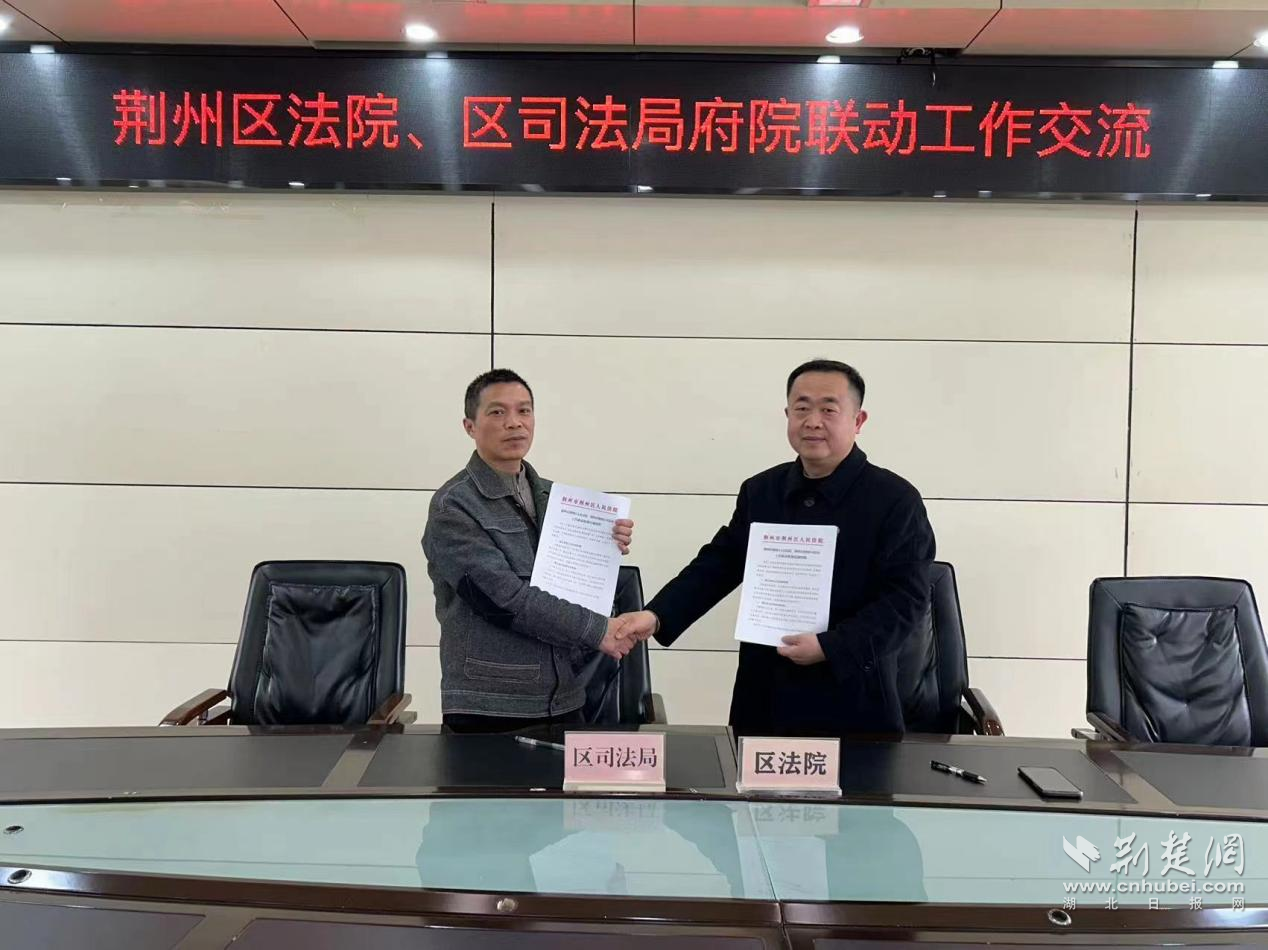 荊州區法院綜合審判庭與荊州區司法局行政復議中心進行府院聯動工作交流,雙方簽署了《工作聯動機制實施細則》,并一同走訪涉訴案件較多的荊州區城市更新服務中心