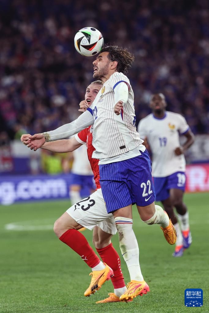 6月17日,法國隊球員特奧·埃爾南德斯(前)與奧地利隊球員維默爾拼搶頭球。新華社記者 潘昱龍 攝