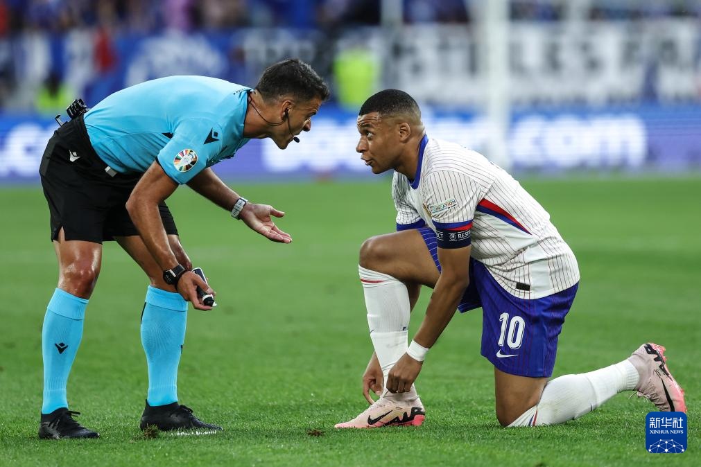 6月17日,法國隊球員基利安·姆巴佩(右)在比賽中與主裁判希爾·曼薩諾交流。新華社記者 潘昱龍 攝