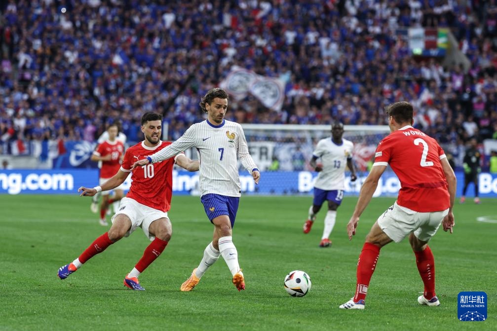 6月17日,法國隊球員格里茲曼(前中)在比賽中傳球。新華社記者 潘昱龍 攝