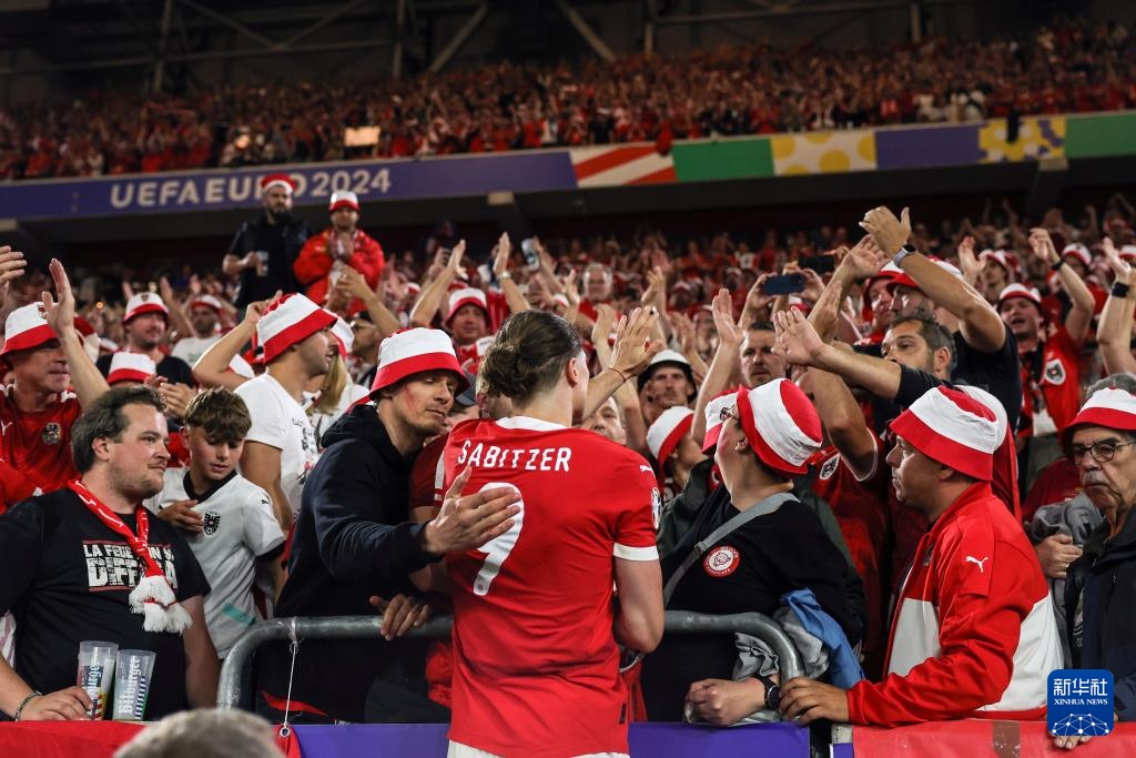 6月17日,奧地利隊球員馬塞爾·薩比策(前中)在賽后向球迷致意。新華社記者 潘昱龍 攝