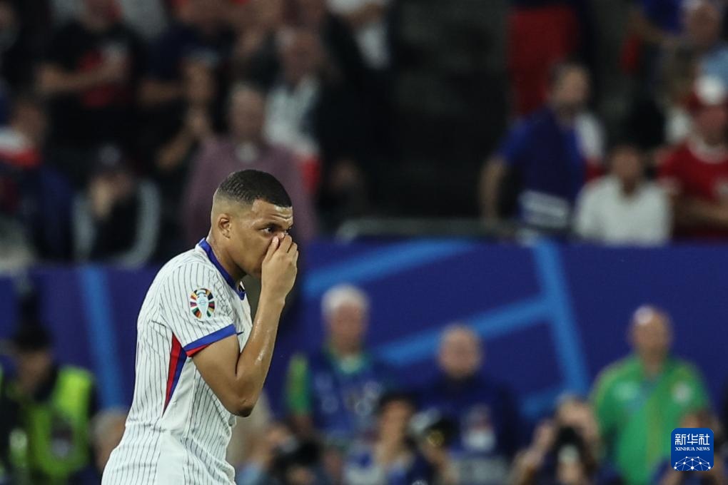 6月17日,法國隊球員基利安·姆巴佩手捂受傷的鼻子返回場地。新華社記者 潘昱龍 攝