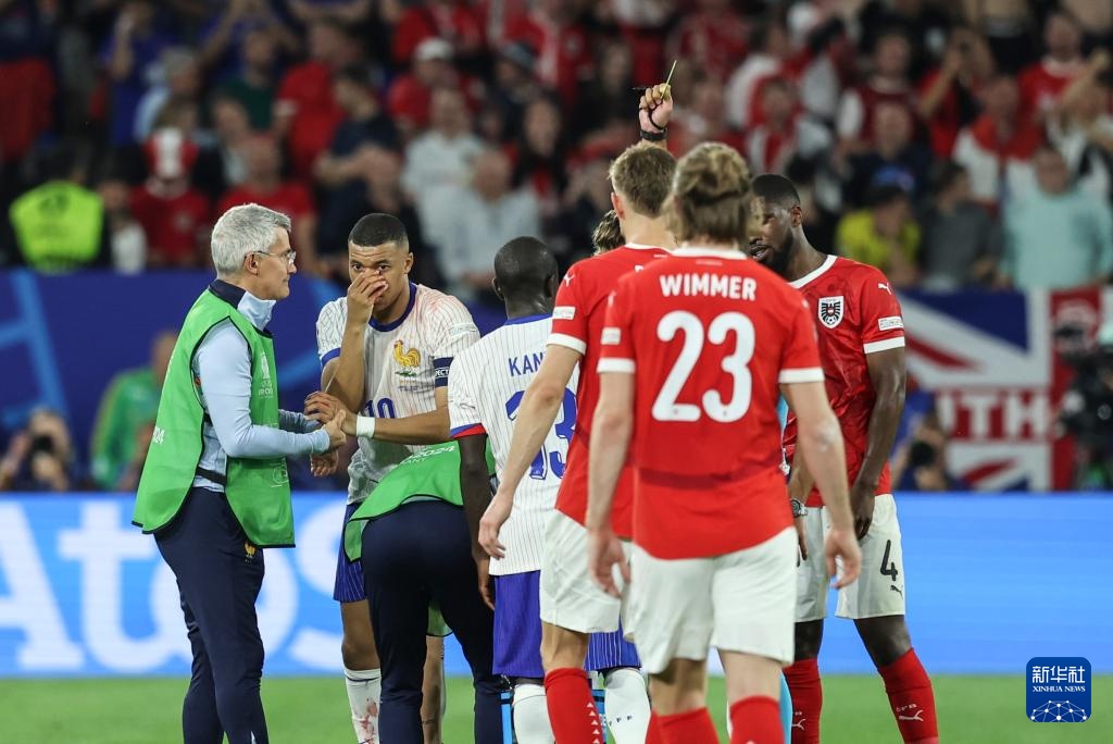 6月17日,法國隊球員基利安·姆巴佩(右二)因鼻子受傷被隊友吉魯(右四)替換下場。新華社記者 潘昱龍 攝