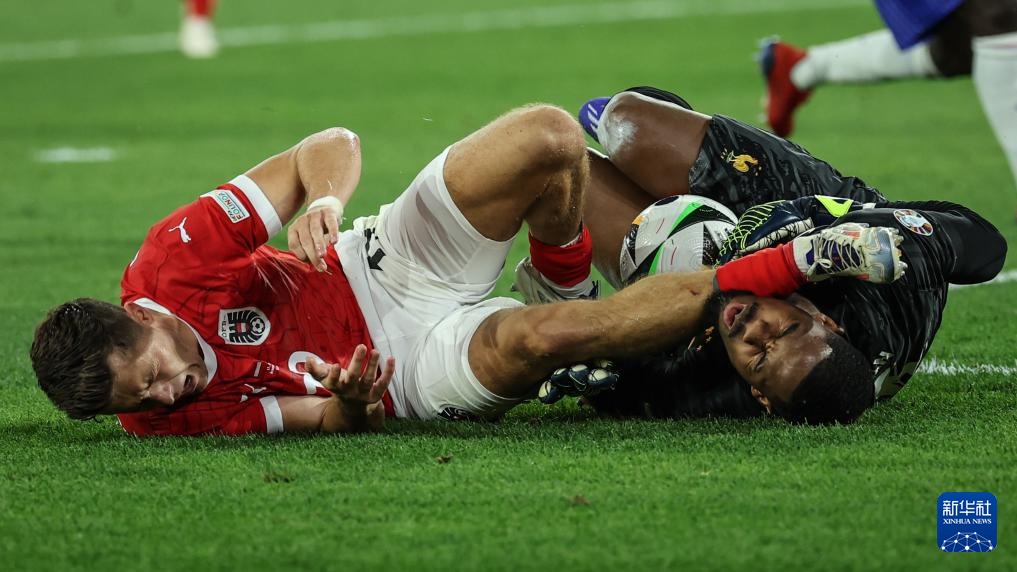 6月17日,奧地利隊球員克里斯托夫·鮑姆加特納(左)在比賽中與法國隊守門員邁克·邁尼昂發生碰撞。新華社記者 潘昱龍 攝