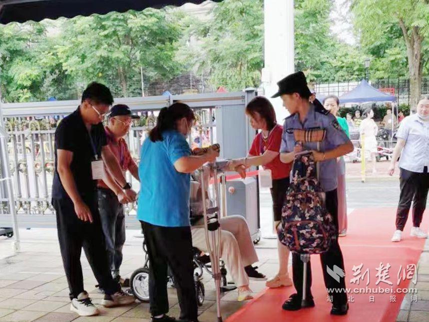 當日數個考點出現了行動不便的考生,護考警力第一時間出手相助。7時40分許,一名坐著輪椅手拿拐杖的考生,來到位于漢陽區的晴川初級中學英才校區考點。護考民警張饒玉竹發現后主動上前,從家長手中接過書包,和學校工作人員一起將考生推進考點,并與監考老師協商,讓她錯峰上樓。在市第二十八中、硚口區十一初中考點,護考特警也分別將一名腳部受傷的考生背進考場。