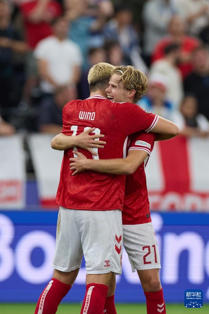 6月20日,丹麥隊球員摩頓·尤爾曼(右)與隊友溫德在比賽中慶祝進球。新華社記者 孟鼎博 攝