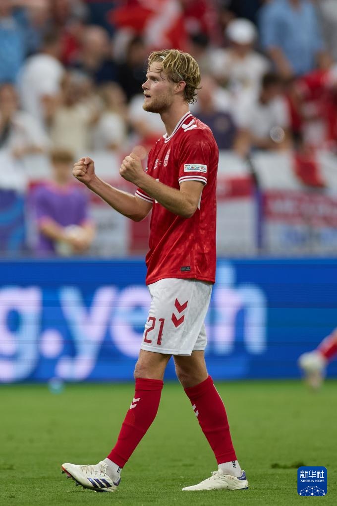 6月20日,丹麥隊球員摩頓·尤爾曼在比賽中慶祝進球。新華社記者 孟鼎博 攝