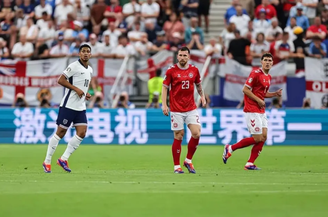 第18分鐘,英格蘭隊沃克下底后倒三角傳中,凱恩門前推射打破僵局。第34分鐘,丹麥隊中場摩頓·尤爾曼轟出一腳無解世界波,皮球如炮彈般擊中立柱內側入網,英格蘭隊守門員皮克福德鞭長莫及。下半場雙方均破門乏術,福登第56分鐘遠射擊中立柱,是英格蘭隊下半場最有威脅的機會。英格蘭隊主教練索斯蓋特早早換下前場三叉戟,本賽季在切爾西發揮出色的小將帕爾默依舊沒能獲得出場機會。1:1的比分保持到終場。