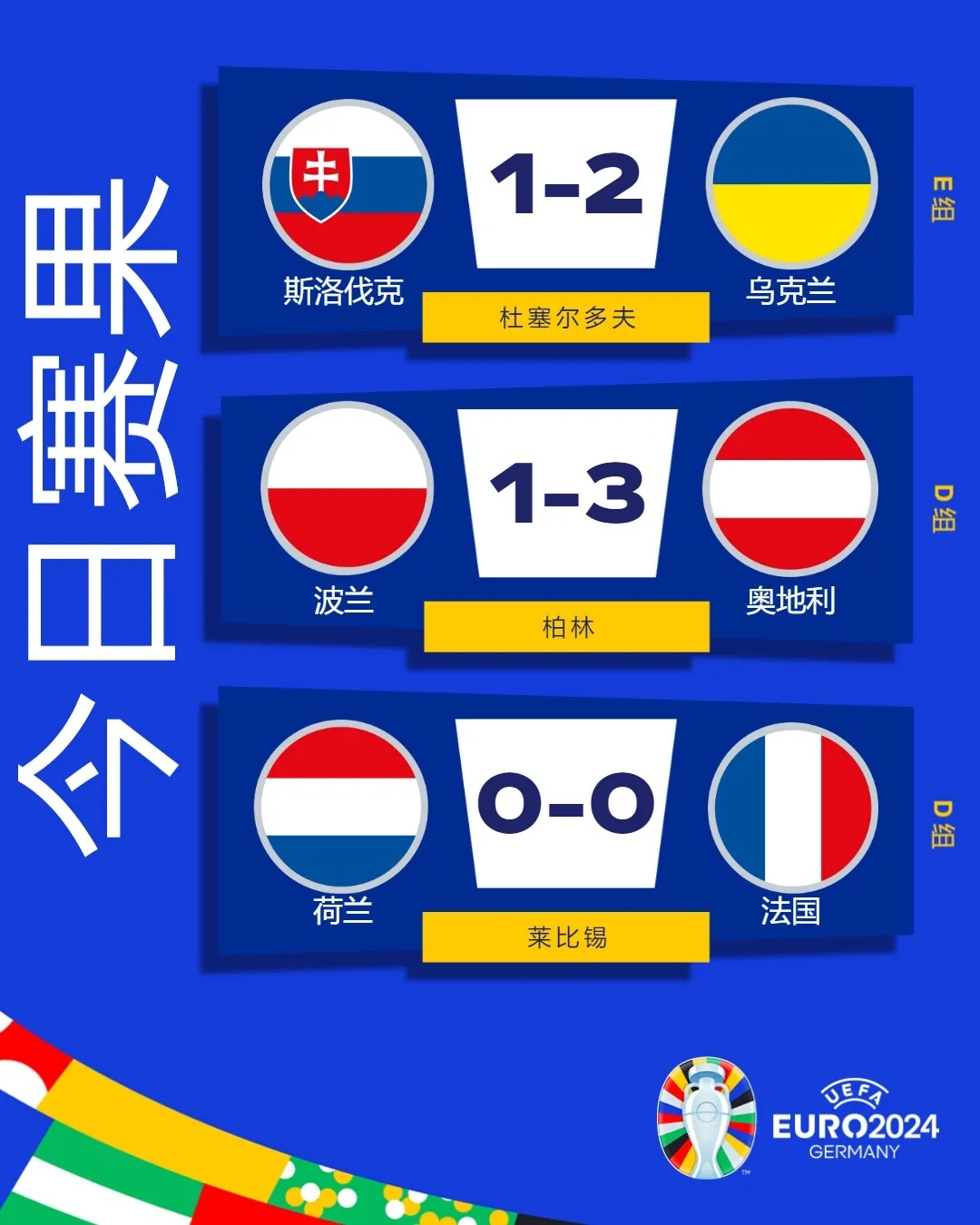 北京時間昨夜今晨,2024歐洲杯小組賽再賽三場。荷蘭隊與法國隊的焦點之戰最終以互交白卷收場,這是本屆杯賽開賽以來首場0:0。兩戰皆負的波蘭隊成為首支確定小組出局的球隊。