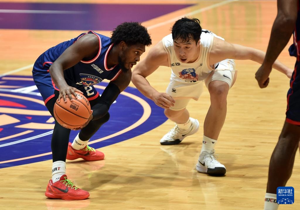 6月23日,長沙灣田勇勝隊(duì)球員考特尼·格蘭特·福特森(左)防守香港金牛隊(duì)球員孫晨然上籃。新華社記者 盧炳輝 攝
