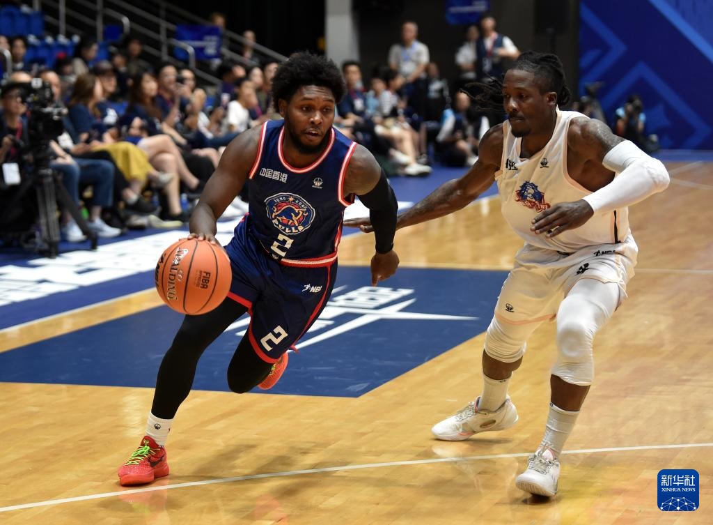 6月23日,香港金牛隊(duì)球員喬丹·沃克(左)在比賽中帶球突破長沙灣田勇勝隊(duì)球員考特尼·格蘭特·福特森。新華社記者 盧炳輝 攝