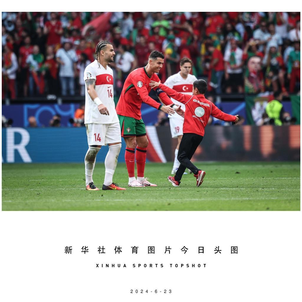 6月22日,葡萄牙隊球員克·羅納爾多(左二)擁抱沖入場地的小球迷。新華社記者 潘昱龍 攝