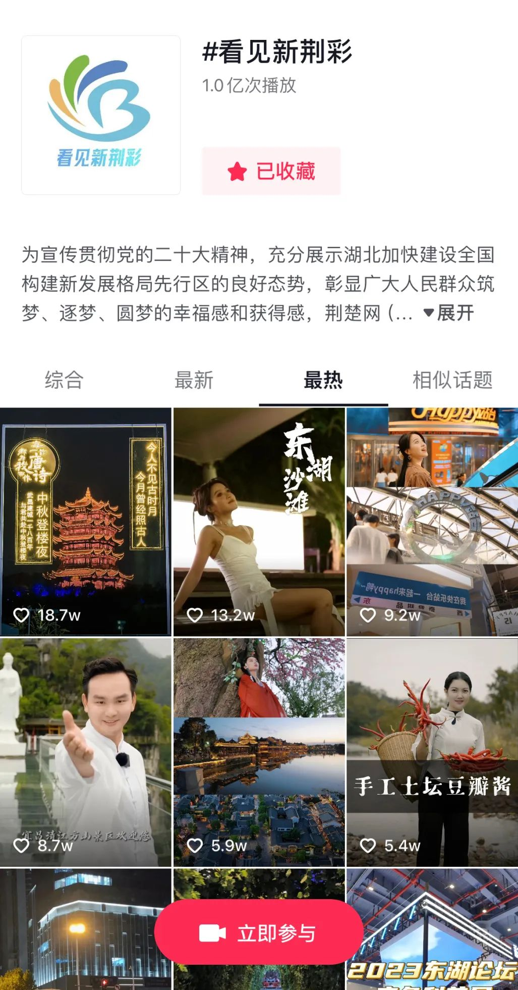 近年來,湖北各級各類主流媒體策劃推出一系列精彩活動,吸引創作者自發進行“視頻+文旅”的融合創作,因地制宜展現湖北的獨特風韻。“看見新‘荊’彩——2023荊楚星主播大賽”由湖北省委網信辦、湖北省文化和旅游廳、湖北省互聯網業聯合會指導,荊楚網(湖北日報網)主辦,吸引了千名主播踴躍參與,競相推介魅力湖北,講述湖北高質量發展的新變化、新面貌、新氣象。截至2023年11月30日,活動共收到參賽作品1200余個,抖音、快手、視頻號三方平臺話題播放總量近2億。