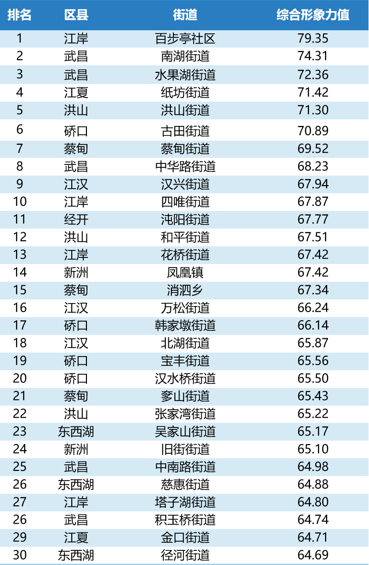 從各區上榜TOP30的情況來看,本期武昌區表現亮眼,有5個街道上榜,包括南湖街道、水果湖街道、中華路街道、中南路街道與積玉橋街道。江岸區與硚口區并列第二,均有4個街道上榜,其中江岸區包括百步亭社區、四唯街道、花橋街道與塔子湖街道;硚口區包括古田街道、韓家墩街道、寶豐街道與漢水橋街道。蔡甸區、東西湖區、洪山區與江漢區并列第三,均有3個街道上榜,蔡甸區包括蔡甸街道、消泗鄉與奓山街道;東西湖區包括吳家山街道、慈惠街道與涇河街道;洪山區包括洪山街道、和平街道與張家灣街道;江漢區包括漢興街道、萬松街道與北湖街道。新洲區與江夏區各有2個街道進入榜單前三十,經開區有1個街道入榜。