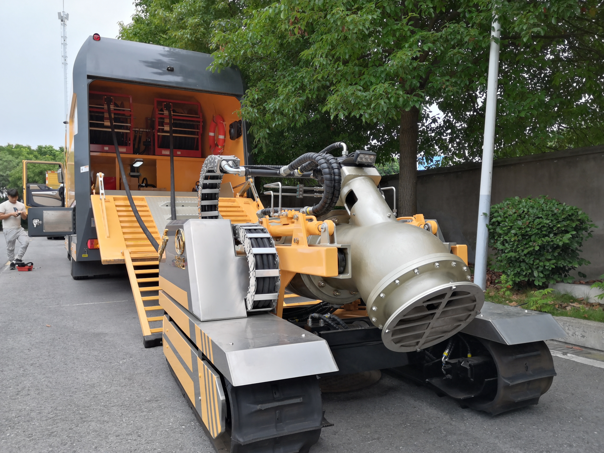 據隨車前來的專家介紹,該設備名叫“龍吸水”大流量排水搶險車,又叫“龍吸水”子母車,科技含量高,主要用于大雨暴雨后的排水搶險。